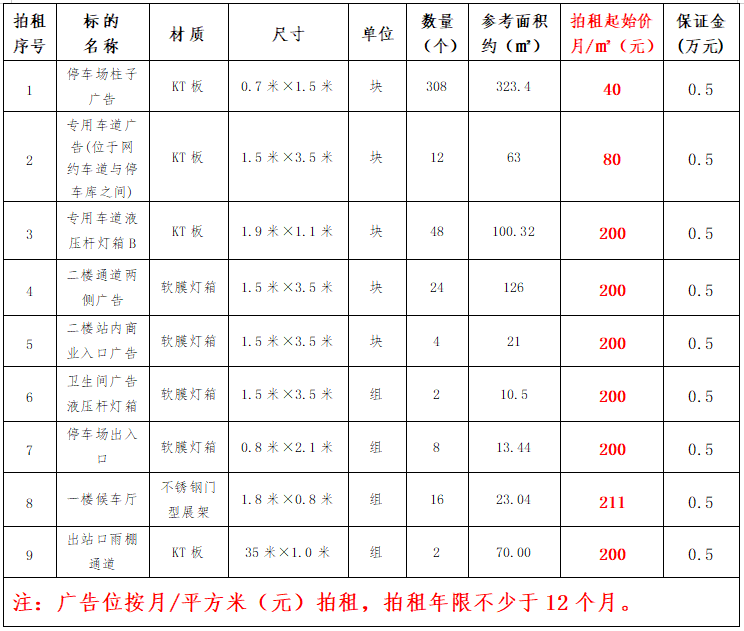 (二)拍租鎮(zhèn)雄縣開(kāi)元商業(yè)物業(yè)服務(wù)有限公司以勒高鐵站站前廣場(chǎng)各類廣告位使用權(quán),詳見(jiàn)下表: